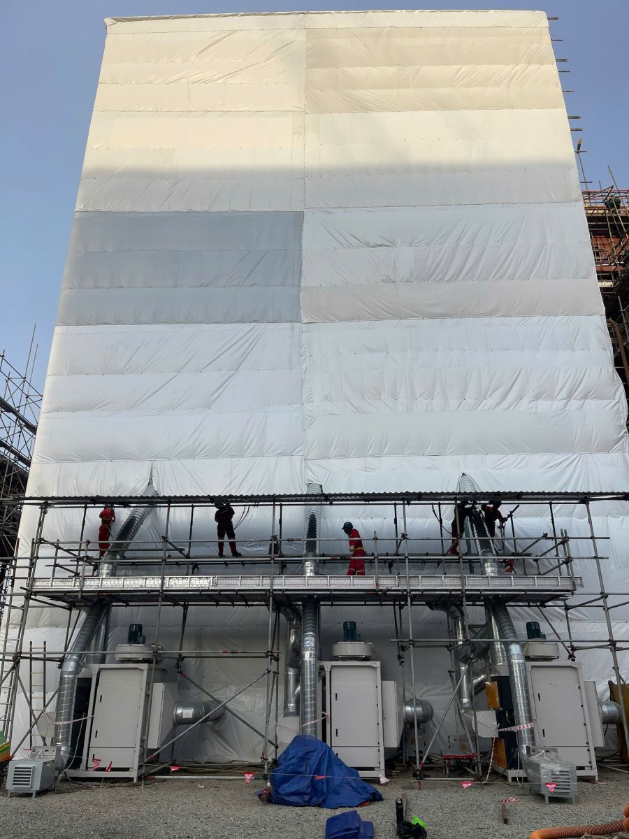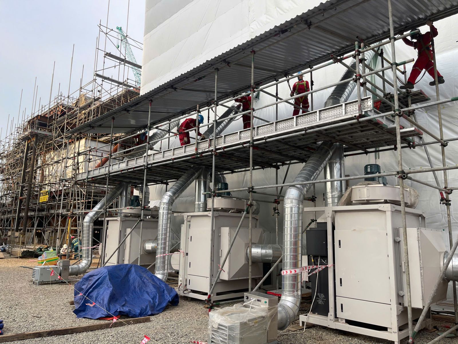 Với kinh nghiệm của mình, SHINDONG đã cung cấp 12 tổ hợp điều ẩm di động, vận hành liên tục 24/24, 3 ca làm việc liên tục đảm bảo duy trì độ ẩm dưới 50%RH trong suốt quá trình phun bi, phun sơn cho 04 OSS. Với đặc thù là các Habitat bao che chứ không phải nhà xưởng kiên cố nên việc đảm, duy trì độ ẩm càng khó hơn so với nhà xưởng cố định. Với đặc thù, điều kiện dự án gặp nhiều khó khăn như vậy. SHINDONG đã tính toán, thiết kế, đưa vào cung cấp các thiết bị điều ẩm di động chuyên dụng, phù hợp với công tác chế tạo của dự án, linh hoạt trong quá trình di chuyển các tổ hợp điều ẩm giữa các OSS hay các part của từng OSS.
