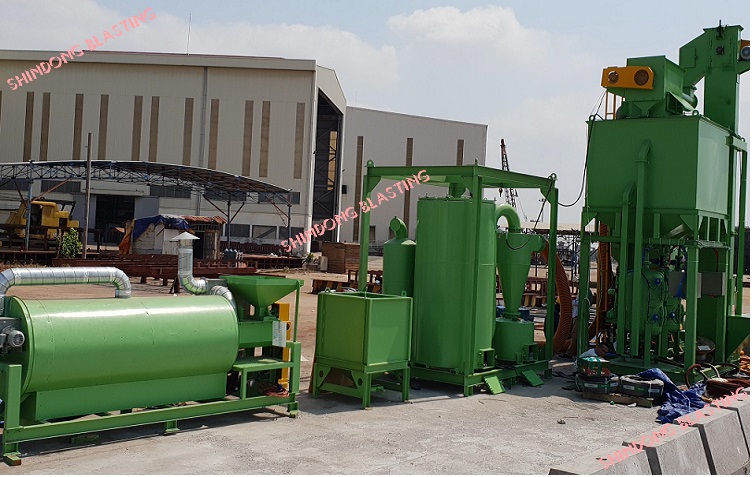 => Đây là dây chuyền máy phun bi hiện đại có quy mô lớn, đầy đủ các công đoạn từ phun bi, thu hồi bi, xử lý tạp chất, xử lý bụi, sấy khô bi, bảo quản bi và hệ thống che chắn bi ngoài trời.